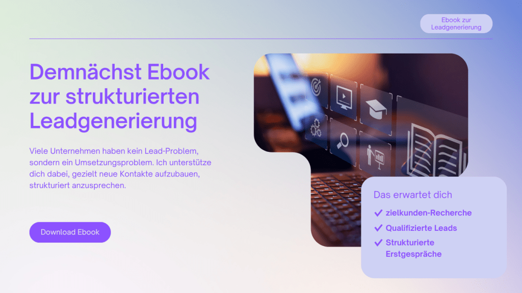 Nach einem kurzen Erstgespräch definieren wir gemeinsam Zielgruppe, Ansprache und Vorgehen. Anschließend übernehme ich die strukturierte Leadgenerierung und halte dich regelmäßig über Fortschritte auf dem Laufenden.